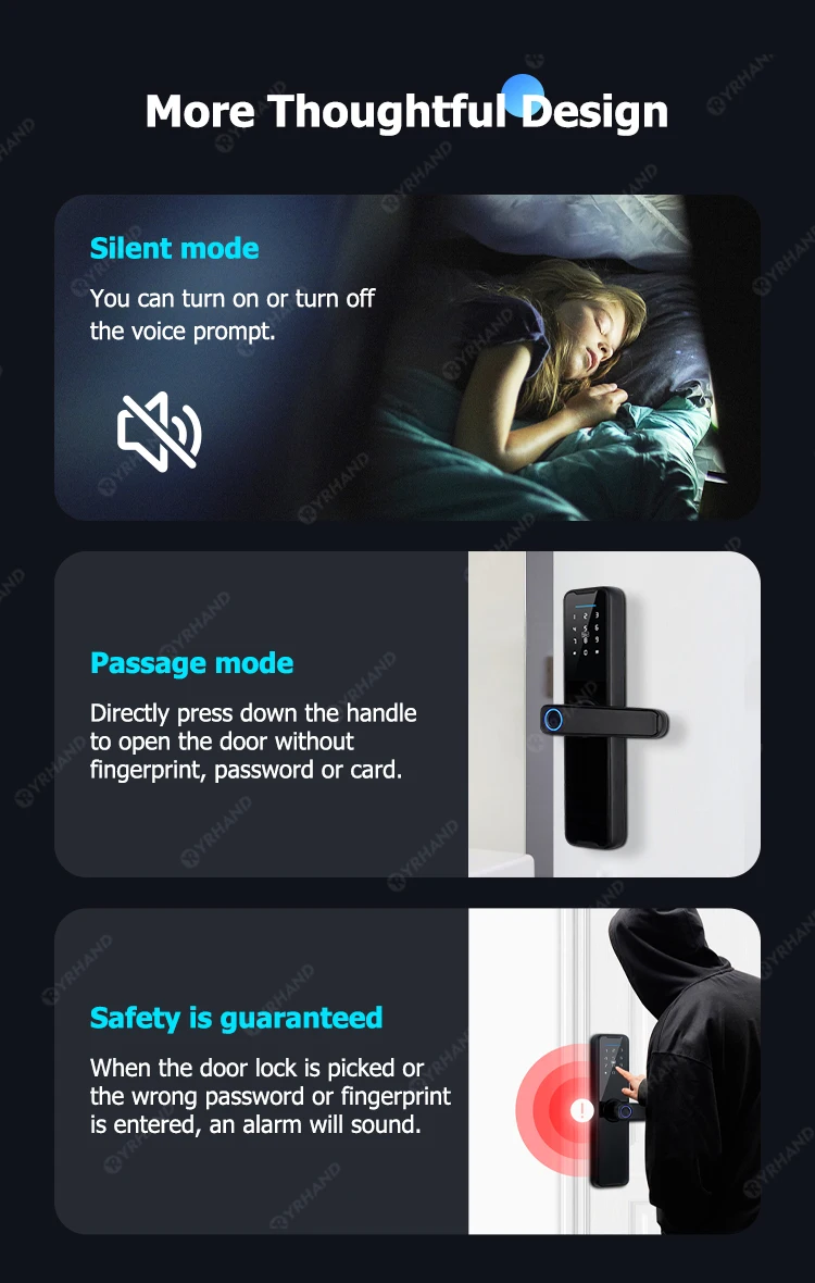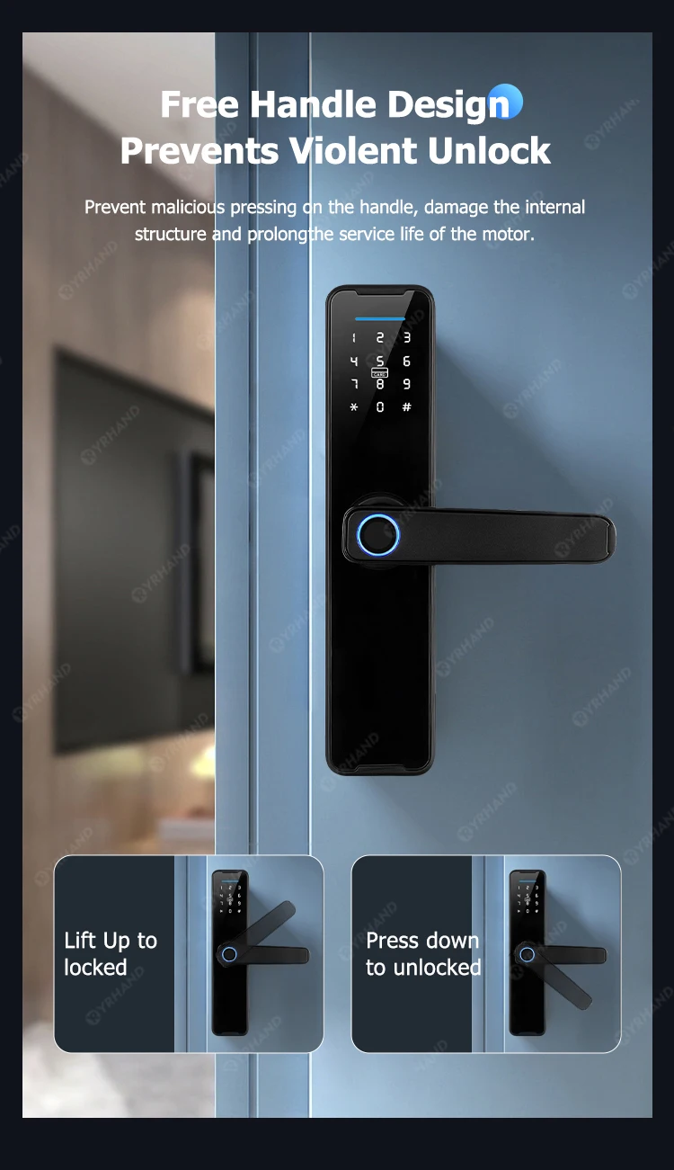 La serrure de porte intelligente biométrique est une mesure de sécurité dont chaque maison a besoin. Dites adieu à chercher frénétiquement vos clés une fois rentré chez vous. Grâce aux fonctionnalités intelligentes de l'application, vous avez beaucoup de liberté quant à la façon dont vous souhaitez protéger votre maison. La sécurité dont vous bénéficiez en l'utilisant renforcera sûrement votre sentiment de sécurité.
